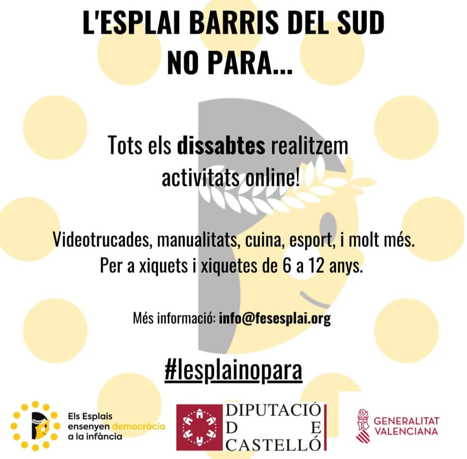Barris del Sud no para!! Cada dissabte realitzem activitats online per a xiquets i xiquetes de 6-12 anys. Més info en info@fesesplai.org